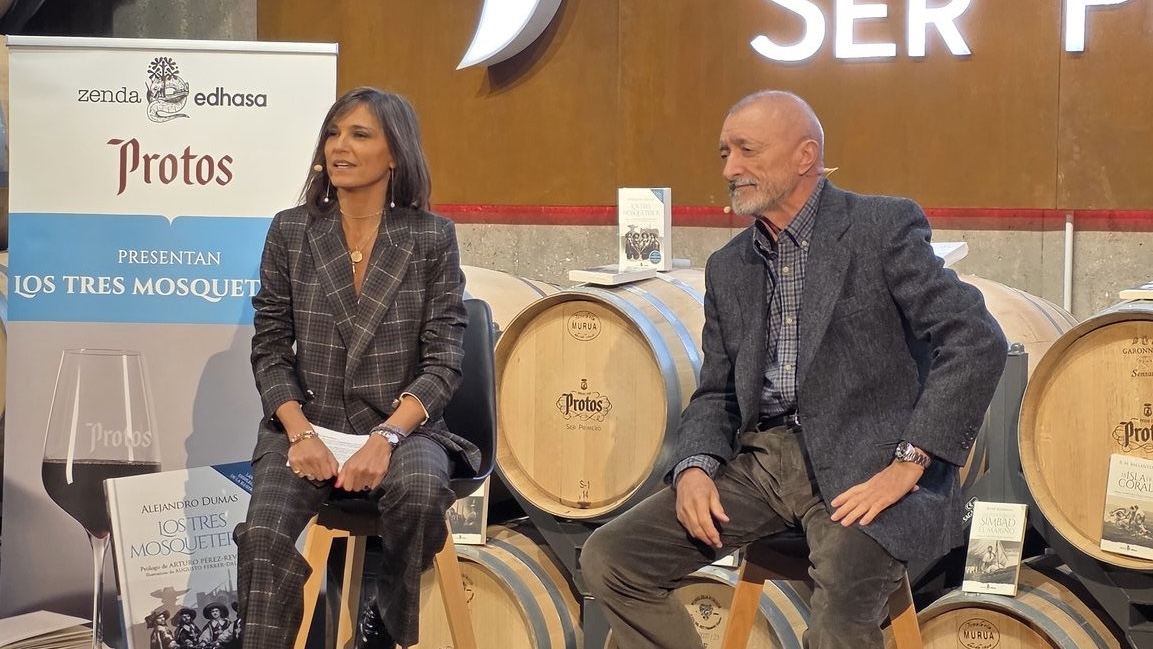 Bajo las bóvedas de Bodegas Protos, entre barricas y el aroma del vino, Zenda–Edhasa ha presentado esta mañana su nueva edición de Los tres mosqueteros, de Alejandro Dumas, con un prólogo inédito de Arturo Pérez-Reverte. La cita reunió al escritor junto a la periodista y cofundadora de Zenda, María José Solano, y al presidente y editor Daniel Fernández, en una conversación dedicada a sus grandes clásicos de aventuras reeditados y al alma de los personajes que los habitan.